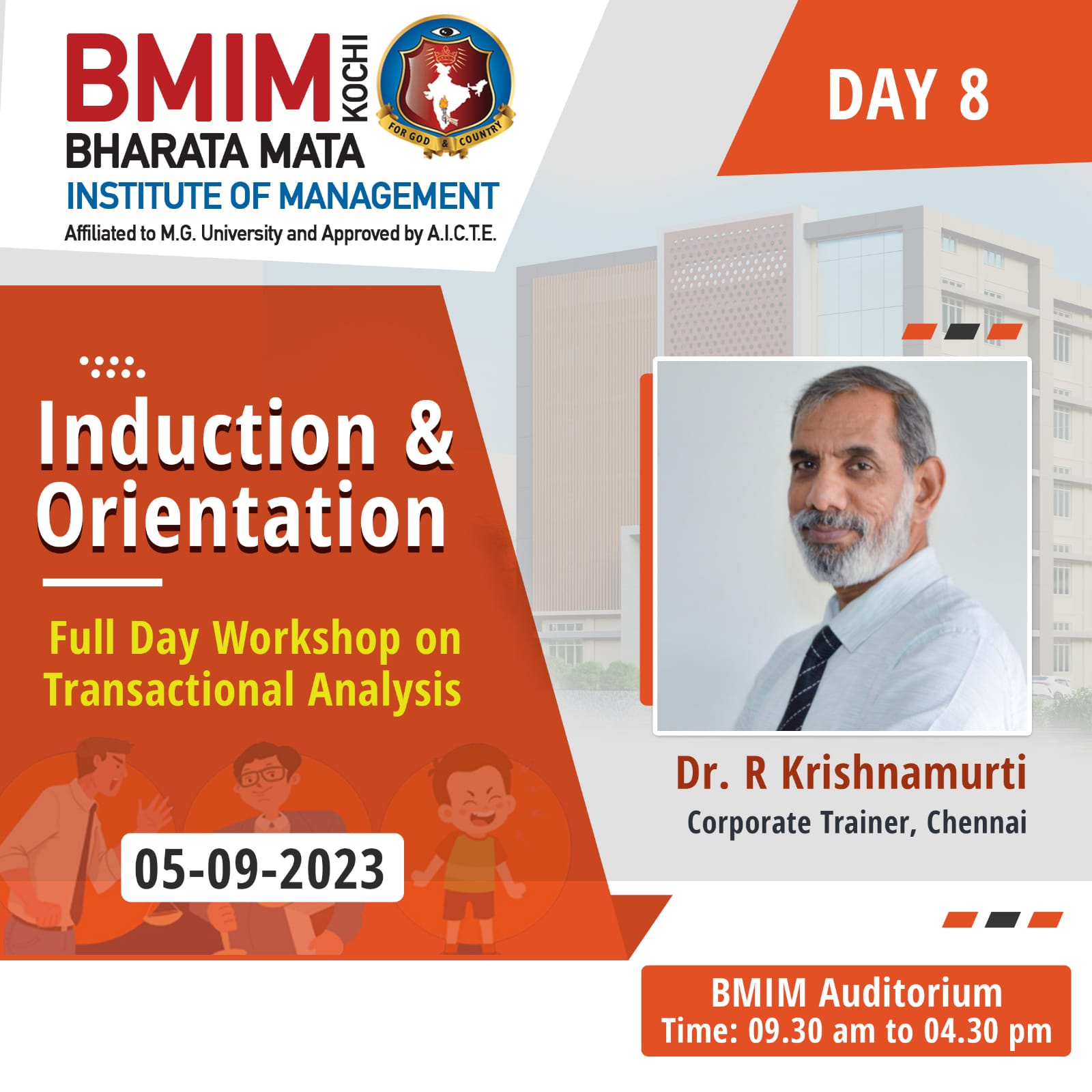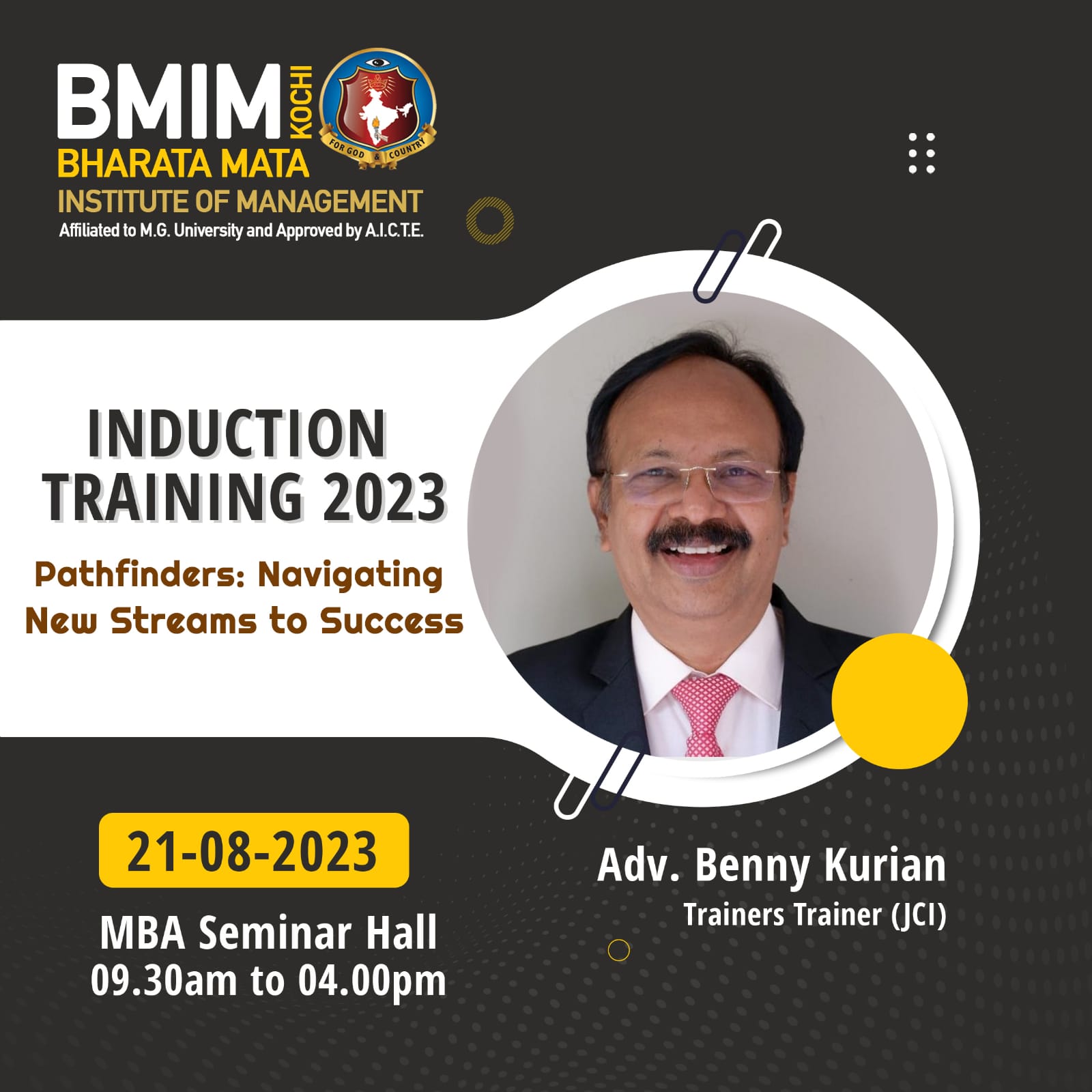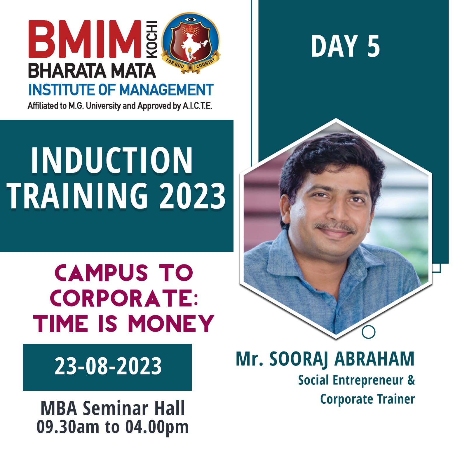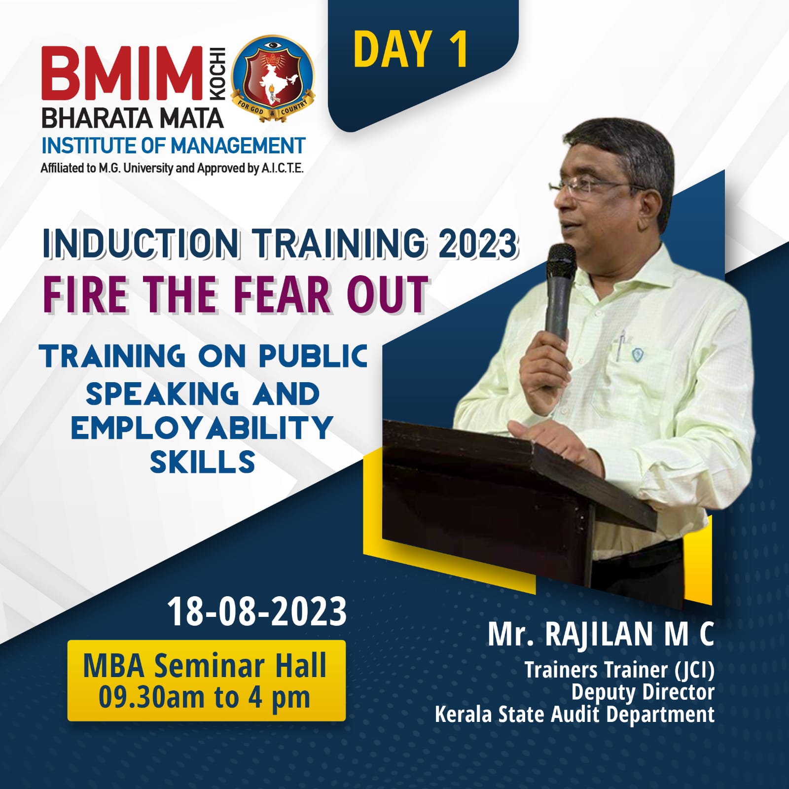 In an effort to acclimatise the first year students to the academic environment in higher educational institutions Bharata Mata Institute of Management initiated student induction programme, spanning seven days from 18th August 2023 for the 2023-25 Batch of MBA. Mr. Rajilan M C, Deputy Director, Kerala State Audit Department and Trainer’s Trainer JCI was the resource person of student induction training programme (SITP -1) on Friday, 18th August 2023.Through activity based sessions and games the resource person underscored the rules to be followed to become effective communicators by keeping the content precise and accentuated that public speaking enhances ones confidence level. He emphasized the major role of soft skills in ramping up employability and highlighted the need for constant practice in tackling stage fear. The One Day training programme was highly interactive and made interesting by including a combination of games and exercise-based modules.