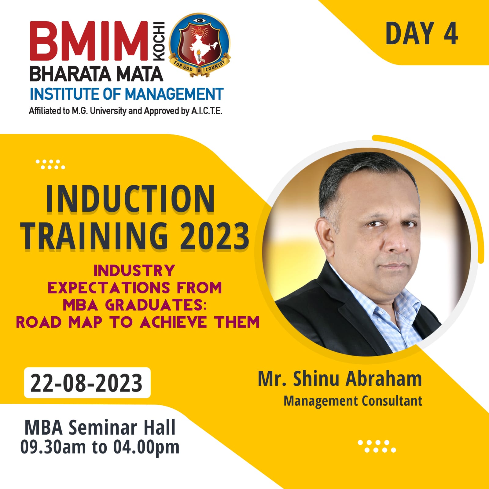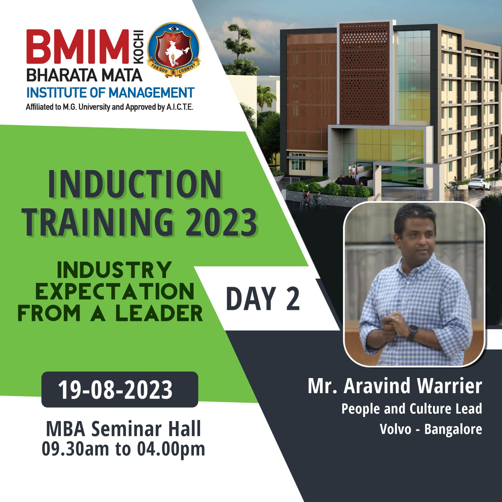 The second day of the Student Induction Training Programme (SITP-2) focussed on the traits and skills employers are expecting in their prospective employees. Mr. Aravind Warrier, People and Culture Lead, Volvo- Bangalore, was the resource person of SITP-2 on 19th August 2023 held at BMIM Seminar Hall. The programme started with a prayer at 9.30 am and Mr. Tomlin Tomichan (1st year Student) welcomed the gathering. The resource person stressed the need to envisage one’s career path by setting realistic expectations and aspirations. He reminded the students that before they embark on job hunt, they should possess both domain knowledge and soft skills. The student participation made the session very interactive. Ms. Avanthika Vidyan(1st year Student) proposed the vote of thanks and the programme ended at 4:30 pm.